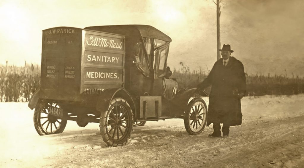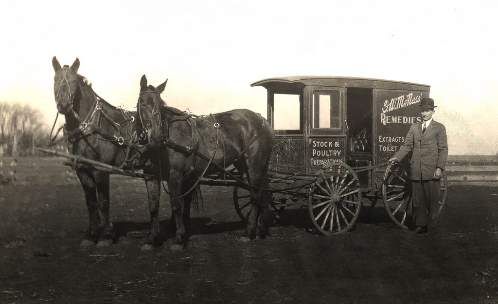 The original McNess Man could have easily travelled by horse and buggy. But it probably didn’t take long before they were all motor powered. Take a peak at a brochure that helped salesmen customize their wagons or automobiles with the ability to carry the McNess products.